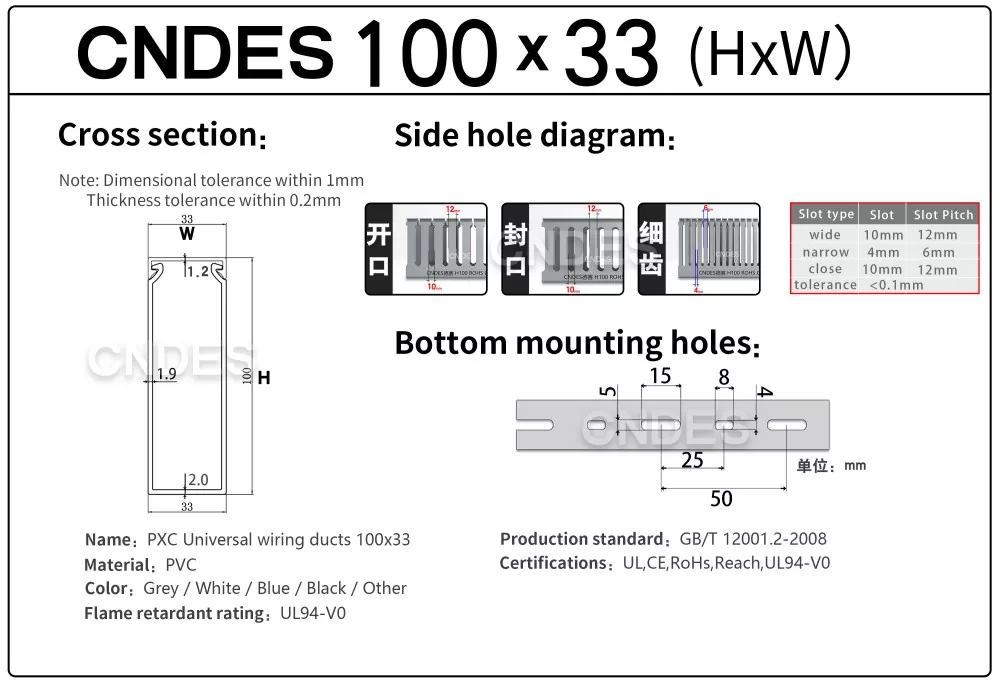 مدیریت کابل رک سرور با کیفیت 100×33 ما از مواد PVC مقاوم در برابر شعله UL94-V0 ساخته شده است که با استانداردهای بین المللی مانند RoHS، REACH، CE، UL و ISO مطابقت دارد و از مقاومت عالی در برابر آتش، دوام و ایمنی عملیاتی طولانی مدت اطمینان می دهد.