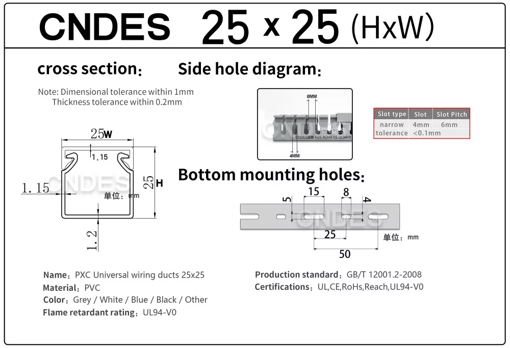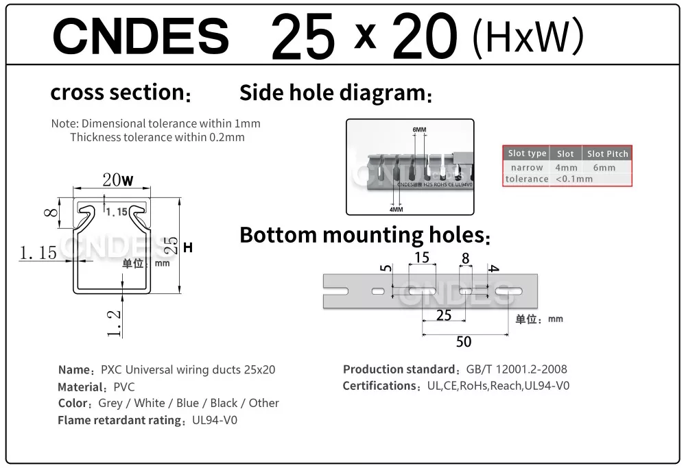 CNDES از طریق تجهیزات مهر زنی با دقت بالا به طور مستقل توسعه یافته، همراه با فرآیند برش خودکار منحصر به فرد، می تواند به طور انعطاف پذیر محصولاتی را با مشخصات متعدد، از جمله کانال های کنترل پنل کنترل شیاردار پی وی سی با کارایی بالا 25 میلی متری تولید کند که نیازهای متنوع مشتریان در کابینت های کنترل و سیستم های الکتریکی را برآورده می کند.