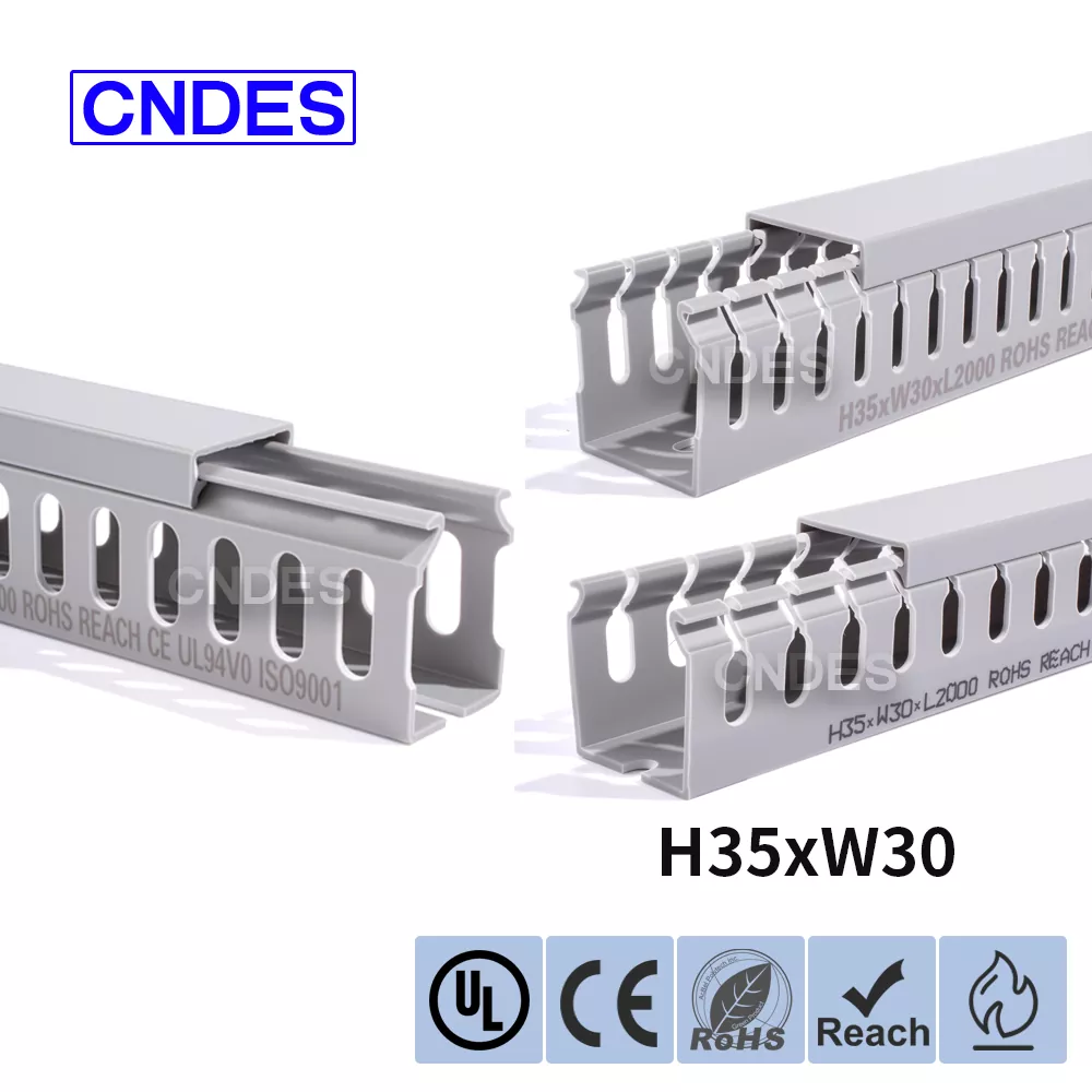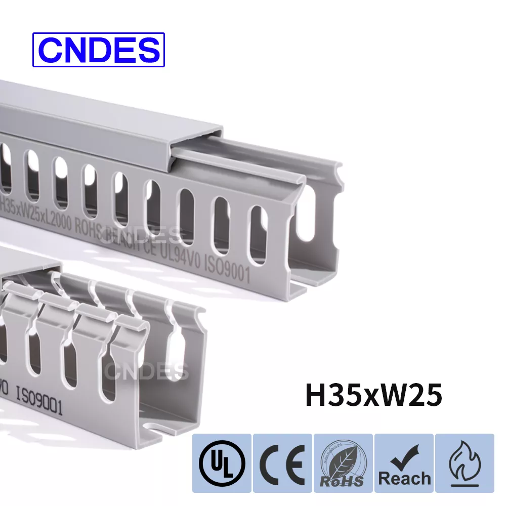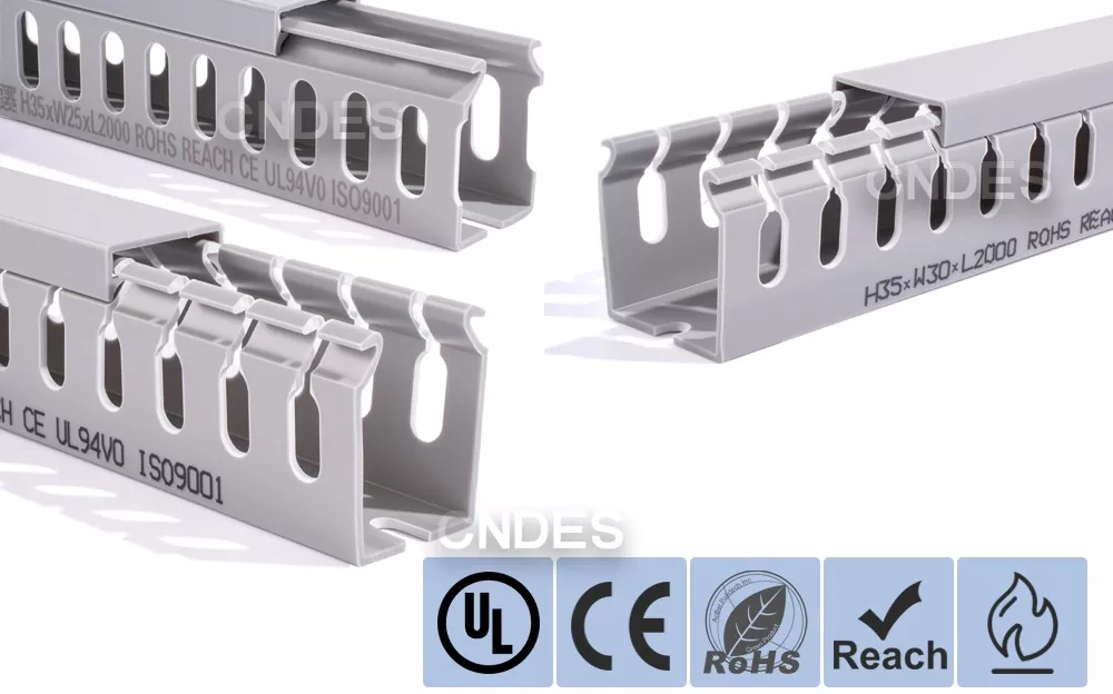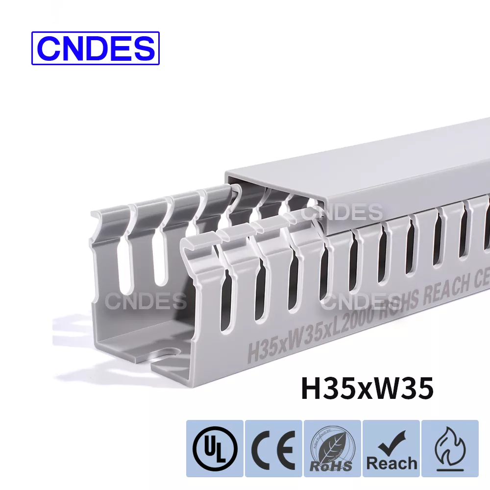 مجرای مسیریابی سیم پی وی سی شیاردار با ارتفاع 35 میلی متری، ساخت شرکت چینی CNDES، از یک پایه پی وی سی سفت و سخت و یک پوشش قابل جابجایی تشکیل شده است. این پایه دارای شیارهای انگشت مانندی است که در هر دو طرف مهر و موم شده اند و "دندان های شانه" را تشکیل می دهند. این دندان ها را می توان با دست شکسته و به سیم اجازه می دهد تا از هر موقعیتی به صورت افقی خارج شود. روکش به راحتی به جای خود باز می گردد و ظاهری مرتب دارد. یک ردیف از سوراخهای نصب در پایین با فاصله استاندارد DIN 43659 مطابقت دارد. می توان آن را با استفاده از پیچ یا پرچ M5 به سرعت روی پانل ها، قاب کابینت یا سازه های مشابه محکم کرد.