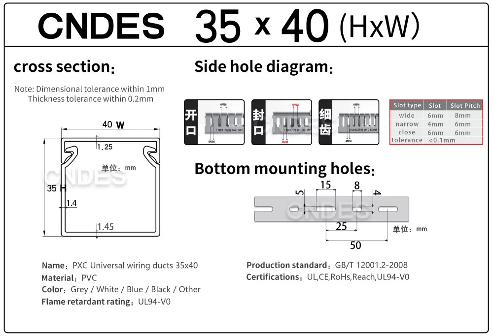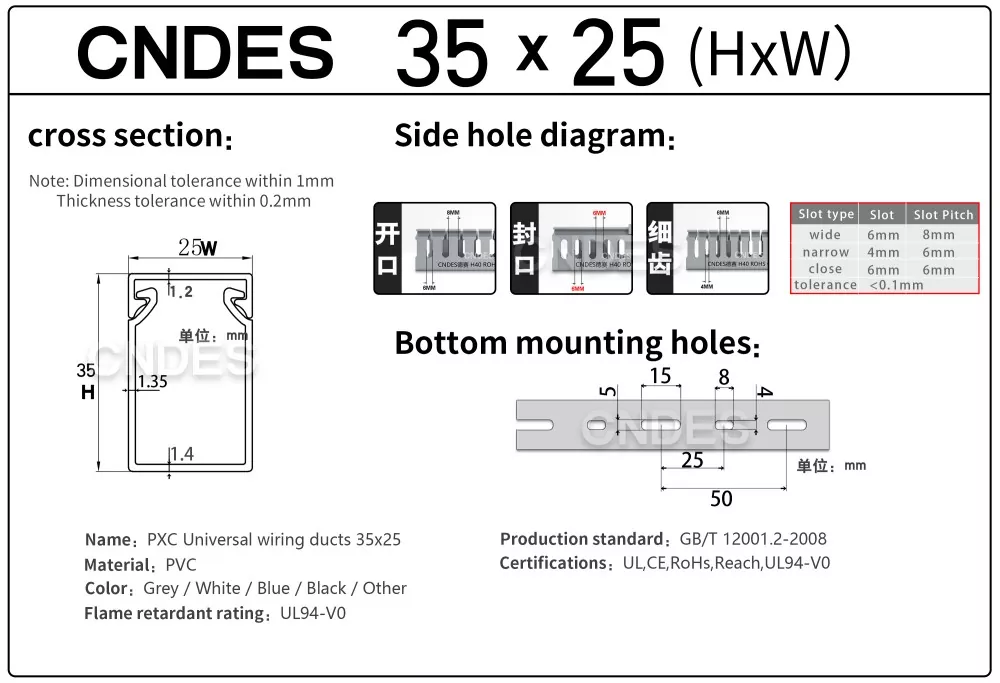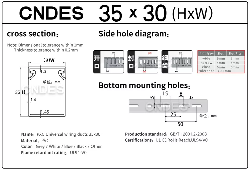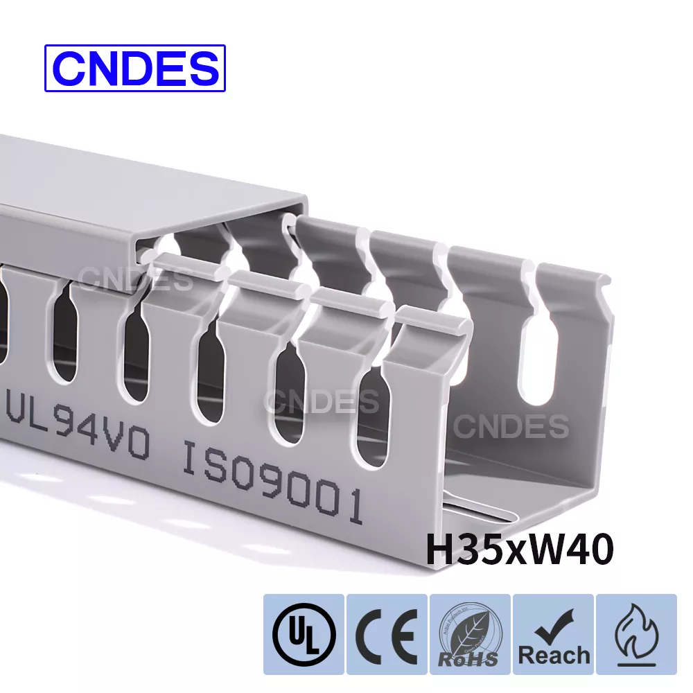 مجرای مسیریابی سیم پی وی سی شیاردار با ارتفاع 35 میلی متری، ساخت شرکت چینی CNDES، از یک پایه پی وی سی سفت و سخت و یک پوشش قابل جابجایی تشکیل شده است. این پایه دارای شیارهای انگشت مانندی است که در هر دو طرف مهر و موم شده اند و "دندان های شانه" را تشکیل می دهند. این دندان ها را می توان با دست شکسته و به سیم اجازه می دهد تا از هر موقعیتی به صورت افقی خارج شود. روکش به راحتی به جای خود باز می گردد و ظاهری مرتب دارد. یک ردیف از سوراخهای نصب در پایین با فاصله استاندارد DIN 43659 مطابقت دارد. می توان آن را با استفاده از پیچ یا پرچ M5 به سرعت روی پانل ها، قاب کابینت یا سازه های مشابه محکم کرد.