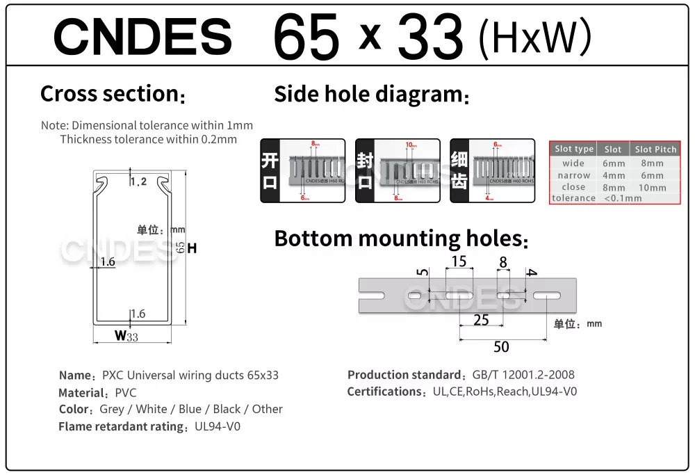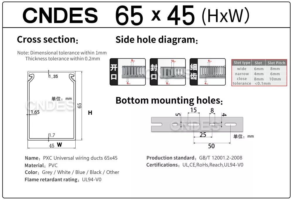 CNDES یک کارخانه منبع کانال سیم کشی کابل PVC با 24 سال تجربه است. کانال سیم کشی صنعتی پی وی سی شیاردار با ارتفاع 65 میلی متری سفارشی یک راه حل ایده آل برای سازماندهی و محافظت از سیم کشی در محیط های با تراکم بالا مانند پانل های کنترل صنعتی، تجهیزات اتوماسیون و تاسیسات ماشین آلات است. با ارتفاع 65 میلیمتر، فضای کافی برای قرار دادن بستههای کابل بزرگتر ارائه میکند و در عین حال از محافظت بهینه در برابر عوامل محیطی مانند گرد و غبار، رطوبت و آسیبهای مکانیکی اطمینان میدهد.