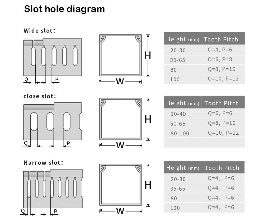 کانالهای سیمکشی پی وی سی شیاردار سفید سفارشی تولید شده توسط شرکت ما بهطور پیشفرض سفید نقرهای است، اما میتوان آن را به رنگ سفید خالص یا سفید نیز سفارشی کرد. ما پروفیل های اسلات مانند شکاف پهن، شکاف باریک، شکاف بسته و دیوار محکم را برای انتخاب شما ارائه می دهیم.